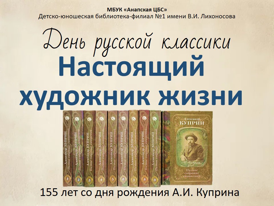 7 сентября 2025 года Россия отмечает 155-летний юбилей Александра Ивановича Куприна, который вошел в историю отечественной литературы как автор повестей и романов, а также как крупнейший мастер рассказа. Предлагаем нашим читателям познакомиться с презентацией «Настоящий художник жизни», посвященной великому русскому писателю. | |