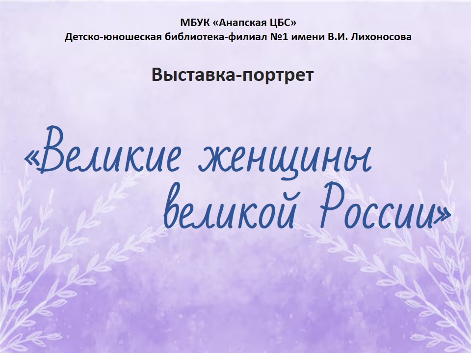 Из поколения в поколение, из века в век женщины преумножали и укрепляли Отечество. Женщины России были мудрыми, терпеливыми, милосердными, несгибаемыми, верными дочерями, сохранили язык, культуру, святыни, рукописи, предания. В преддверии праздника Международного женского дня знакомим читателей с выставкой-портретом «Великие женщины великой России». | |
